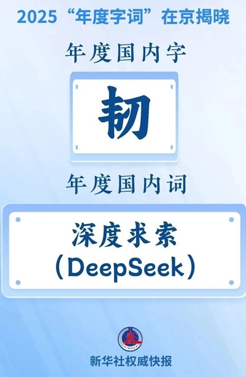 23일 공인일보사(工人日报社)는 중국 국가언어자원모니터링 연구센터, 상무인서관, 신화망이 지난 19일 공동 주최한 ‘2025중국어 결산(汉语盘点2024)’ 발표회에서 올해의 한자와 단어로 각각 ‘인(韧)’과 ‘딥시크(deepseek, 深度求索)’를 선정했다고 보도했다.