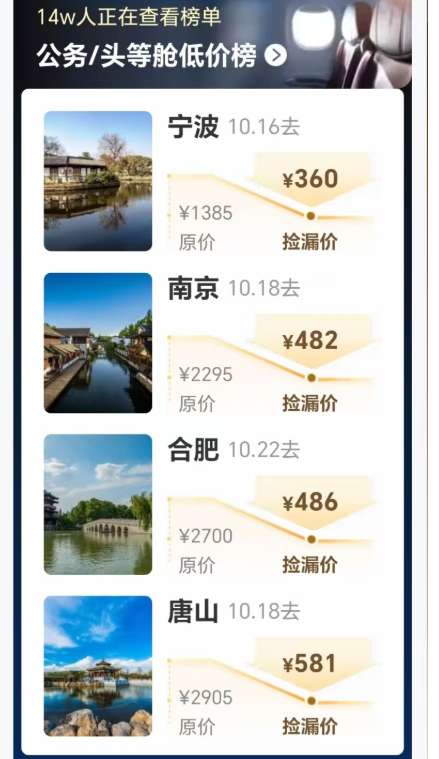•10월 25일 기준 상하이→시안: 420위안 상하이→청두: 500위안 상하이→쿤밍: 481위안 베이징→시안: 320위안 베이징→칭다오: 395위안 베이징→우루무치: 480위안