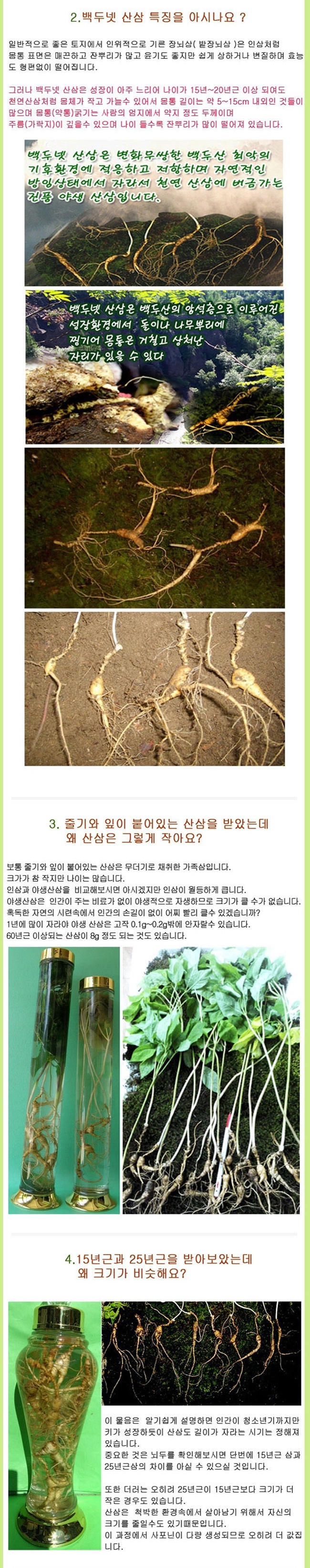본문 8115호 -야생산삼 한세트 4뿌리 제조사/원산지 백두넷 성산약초/백두산 단위 / 무게 25년근 한세트 4뿌리 판매가 750,000 할인가 650,000 구매문의 상품정보 이전글 다음글 목록