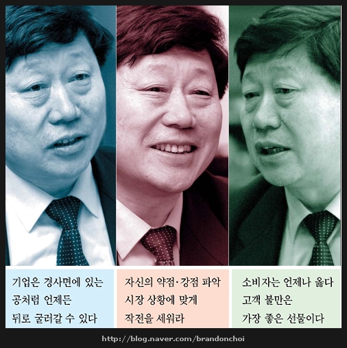 중국 최대의 전자회사CEO 張瑞敏海爾회장의 성공원칙① 결점이 있는 상품은 곧 폐품이다.② 동쪽이 어두울 때면 서쪽에 서광이 비친다는 사실을 기억하라.③ 문제가 발생하면 '해결해야 하는가'를 따져 볼 것이 아니라 '누가 나서서 해야 하는가' 를 따져 보아야 한다.④ 시장은 늘 준비되어 있으며 문제는 아이디어가 팔릴만 한 것…(2016-10-08 01:23:18)