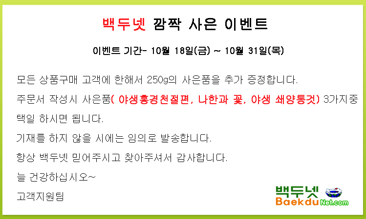 백두넷성산약초 전면 개편되여 새롭게 태여났습니다 인기글 안녕하세요. 백두넷 탄생 8주년을 맞아 본사 쇼핑몰 백두넷 성산약초는 고객님들에게 최적화된 쇼핑환경 제공을 위해 전면 개편되여 새롭게 태여났습니다 이 새로운 날에 백두넷 성산약초를 성장시켜주신 회원님들과 고객 여러분들에게 진심으로 감사드립니다. 백두넷 성산약초는 최신 쇼핑몰 솔루션을 적용하여 보다 모든 것이 편리하도록 개편되었습니다. 디지인도 새롭게 단장하고 바로 구매하기 , 회원가입 등 여러가지로 아주 편리하게 하였습니다 특히 국제무료배송에서 한국, 일본 등 나라 고객 여러…(2014-03-23 08:30:22)